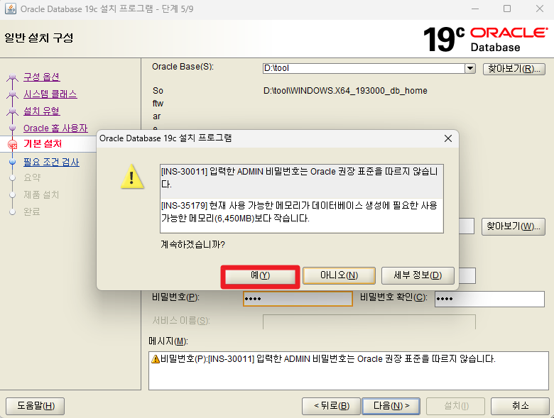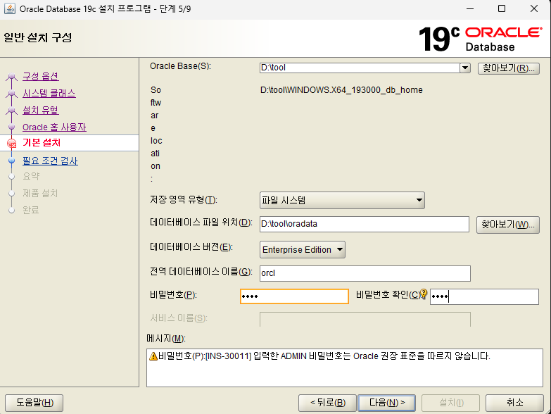 나는 방화벽 허용여부 팝업창이 자동으로 떠서 방화벽허용하니 오라클 설치가 계속 진행됨
