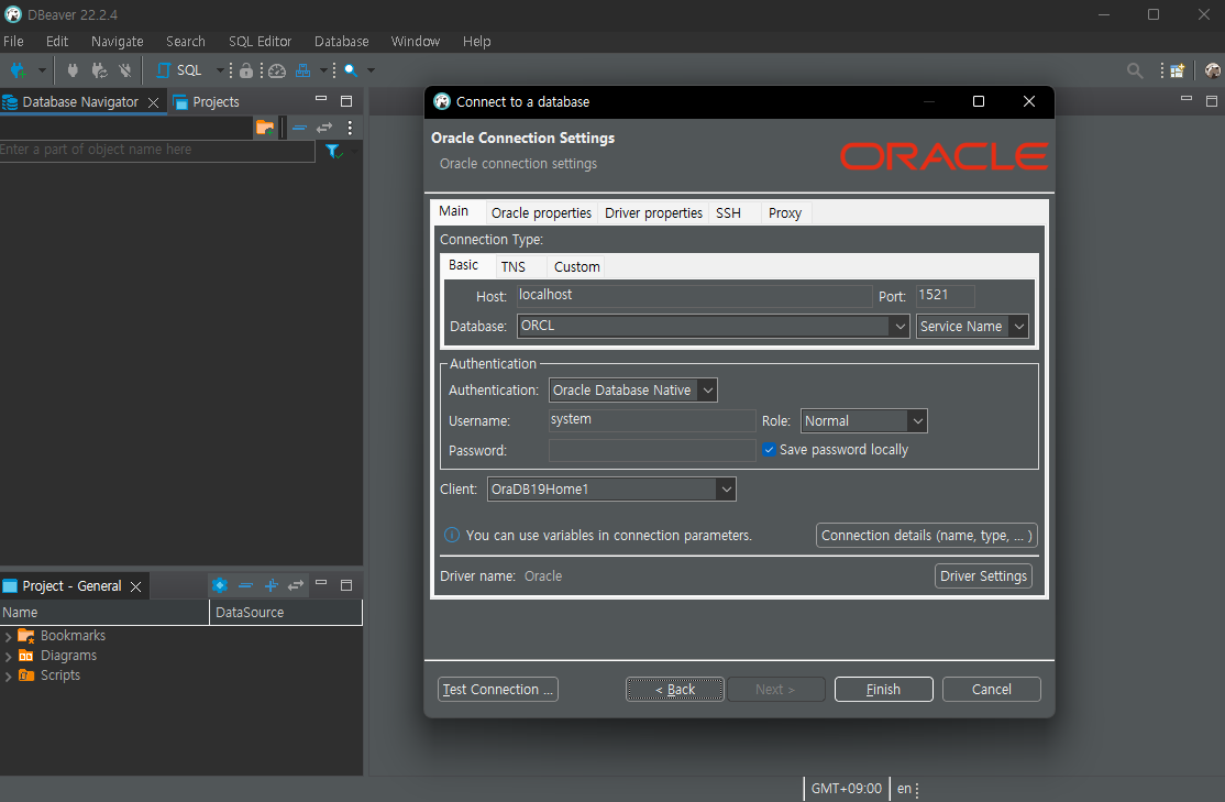 DB 종류는 Oracle 선택하고나면, 연결설정에 입력 디폴트값이 자동으로 아래와 같이 들어가 있다.
