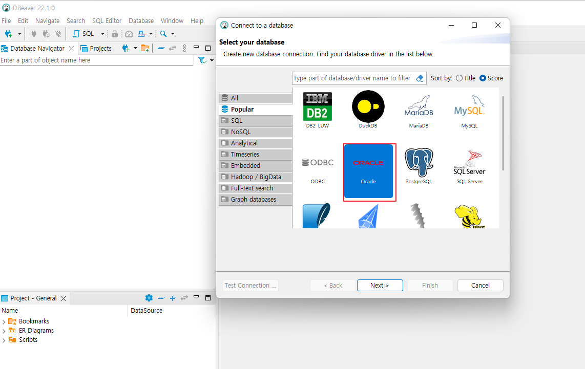 2. 아래캡쳐화면의 파란 버튼을 누르면 연결할 DB목록들이 뜨는데 우리는 ORACLE 연결할거니까 오라클 클릭