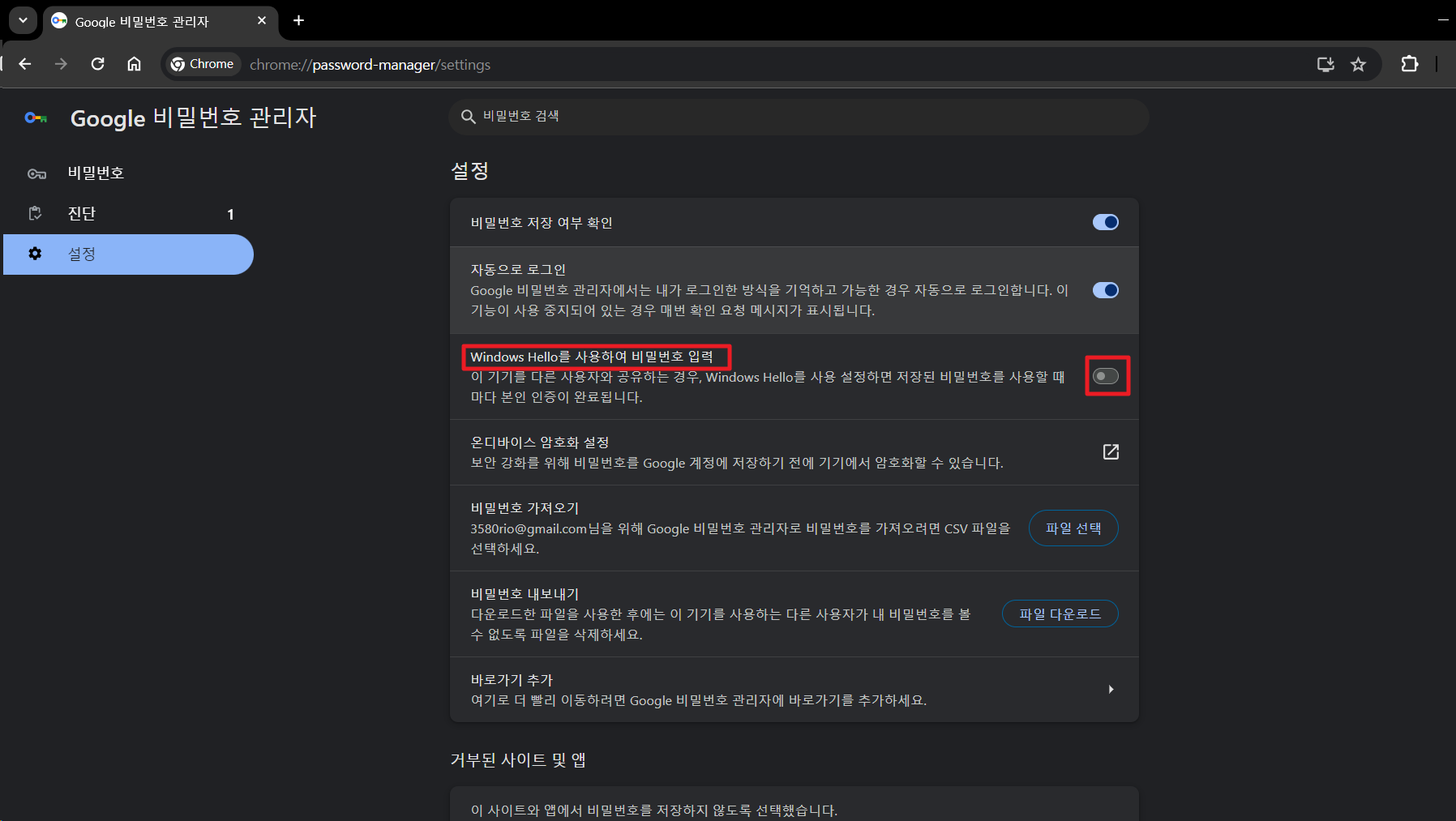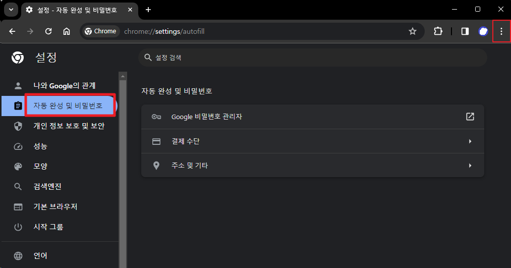 chrome 브라우저에서 설정한다. ---> 우측 상단 점 3개로 된 곳을 클릭 --> 자동 완성 및 비밀번호 --- >