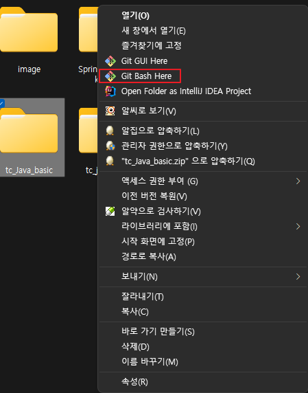 내 로컬 작업폴더 마우스 우클릭 > 더 많은 옵션표시 클릭 > Git Bash Here 클릭하면 깃 터미널이 뜬다.