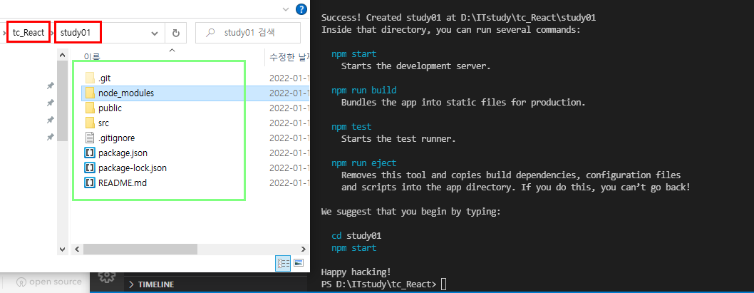 조금 기다리면 설치가 완료되고 아까 만들었던 tc_React라는 폴더안에 터미널에서 만들었던 프로젝트명study01이 생성되고 그안에 자동으로 필요한 라이브러리가 생성된 것을 볼 수 있다.